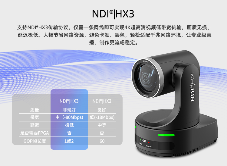 支持ONVIF、SRT、RTSP、RTMP、Free D、NDI®|HX2(可选)等网络协议。