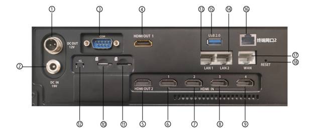 4 | 终端第一路输出(主屏幕显示环出) | 18 | 路由器重启按键 |
